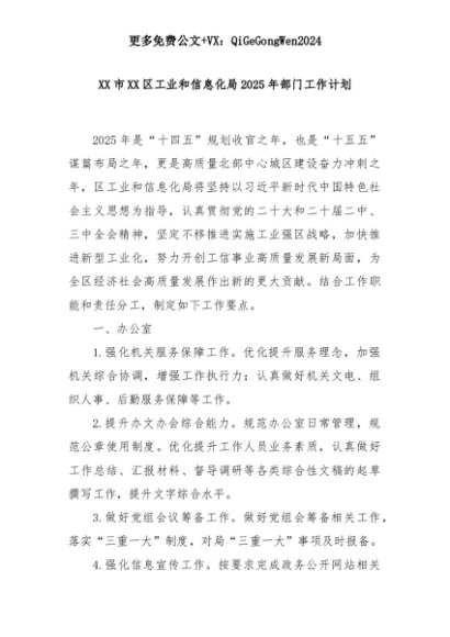【七哥公文】2025年:XX市XX区工业和信息化局2025年部门工作计划+更多免费公文+VX:QiGeGongWen2024+更多免费公文+VX:QiGeGongWen2024