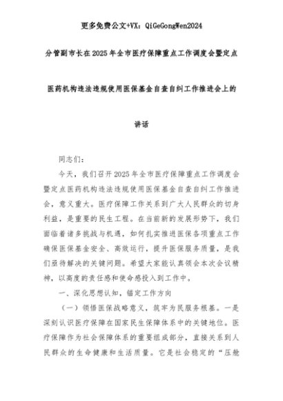 【七哥公文】2025年:分管副市长在2025年全市医疗保障重点工作调度会暨定点医药机构违法违规使用医保基金自查自纠工作推进会上的讲话+更多免费公文+VX:QiGeGongWen2024+更多免费公文+VX:QiGeGongWen2024