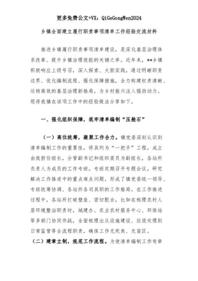 【七哥公文】2025年:乡镇全面建立履行职责事项清单工作经验交流材料+更多免费公文+VX:QiGeGongWen2024+更多免费公文+VX:QiGeGongWen2024