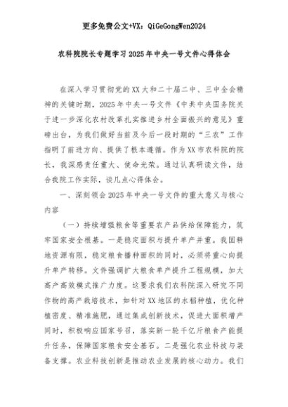 【七哥公文】2025年:农科院院长专题学习2025年中央一号文件心得体会+更多免费公文+VX:QiGeGongWen2024+更多免费公文+VX:QiGeGongWen2024