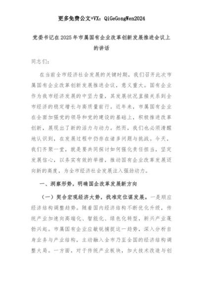 【七哥公文】2025年:党委书记在2025年市属国有企业改革创新发展推进会议上的讲话+更多免费公文+VX:QiGeGongWen2024+更多免费公文+VX:QiGeGongWen2024