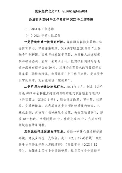 【七哥公文】2025年:县监管办2024年工作总结和2025年工作思路+更多免费公文+VX:QiGeGongWen2024+更多免费公文+VX:QiGeGongWen2024