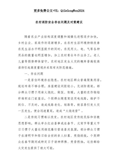 【七哥公文】2025年:农村消防安全存在问题及对策建议+更多免费公文+VX:QiGeGongWen2024+更多免费公文+VX:QiGeGongWen2024