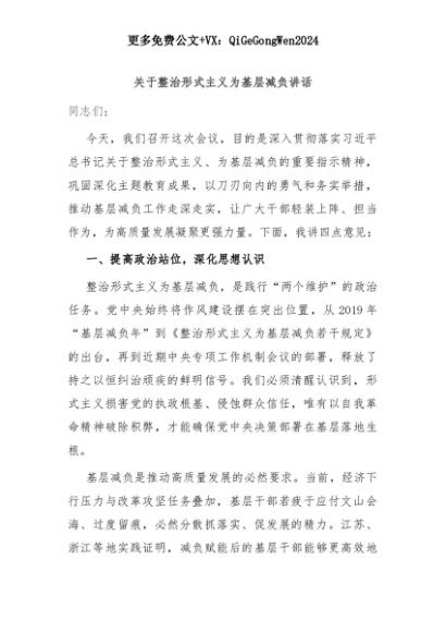 【七哥公文】2025年:关于整治形式主义为基层减负讲话+更多免费公文+VX:QiGeGongWen2024+更多免费公文+VX:QiGeGongWen2024
