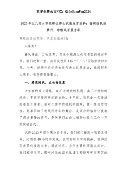 【七哥公文】2025年:2025年三八妇女节表彰优秀女代表发言材料:奋楫扬帆逐梦行,巾帼风采展芳华+更多免费公文+VX:QiGeGongWen2024+更多免费公文+VX:QiGeGongWen2024