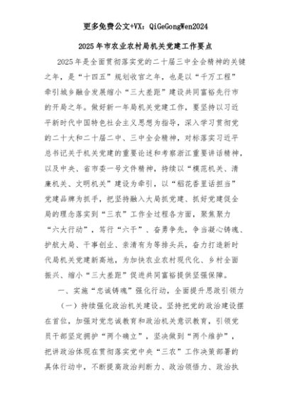 【七哥公文】2025年:2025年市农业农村局机关党建工作要点+更多免费公文+VX:QiGeGongWen2024+更多免费公文+VX:QiGeGongWen2024