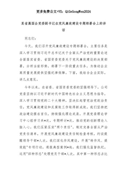 【七哥公文】2025年:【七哥公文】某省属国企党委副书记在党风廉政建设专题部署会上的讲话+更多免费公文+VX:QiGeGongWen2024+更多免费公文+VX:QiGeGongWen2024