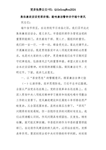 【七哥公文】2025年:【七哥公文】集体廉政谈话党课讲稿:敲响廉洁警钟共守端午清风+更多免费公文+VX:QiGeGongWen2024+更多免费公文+VX:QiGeGongWen2024