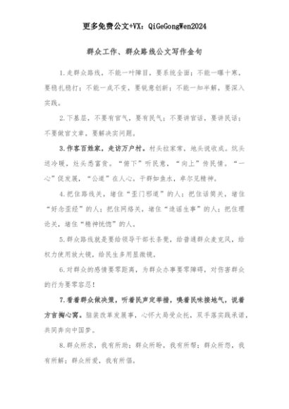 【七哥公文】2025年:【七哥公文】群众工作、群众路线公文写作金句+更多免费公文+VX:QiGeGongWen2024+更多免费公文+VX:QiGeGongWen2024