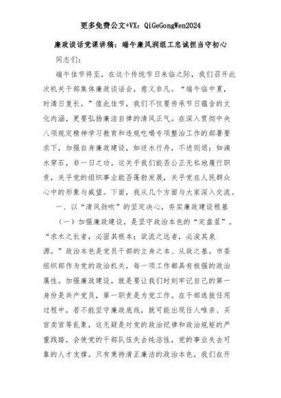【七哥公文】2025年:【七哥公文】廉政谈话党课讲稿:端午廉风润组工忠诚担当守初心+更多免费公文+VX:QiGeGongWen2024+更多免费公文+VX:QiGeGongWen2024