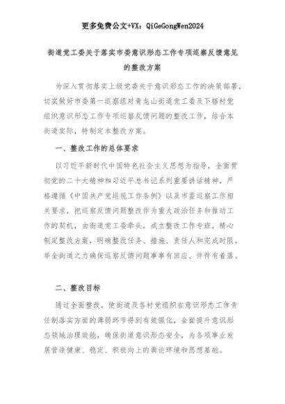 【七哥公文】2025年:【七哥公文】街道党工委关于落实市委意识形态工作专项巡察反馈意见的整改方案+更多免费公文+VX:QiGeGongWen2024+更多免费公文+VX:QiGeGongWen2024
