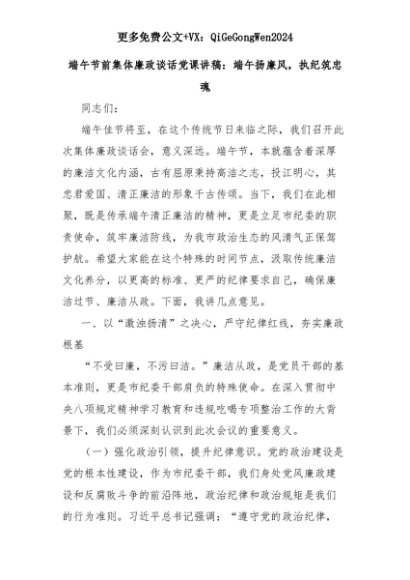 【七哥公文】2025年:【七哥公文】端午节前集体廉政谈话党课讲稿:端午扬廉风,执纪筑忠魂+更多免费公文+VX:QiGeGongWen2024+更多免费公文+VX:QiGeGongWen2024