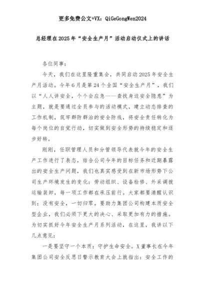 【七哥公文】2025年:【七哥公文】总经理在2025年“安全生产月”活动启动仪式上的讲话+更多免费公文+VX:QiGeGongWen2024+更多免费公文+VX:QiGeGongWen2024