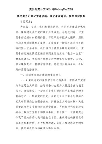 【七哥公文】2025年:【七哥公文】镇党委书记廉政党课讲稿:强化廉政意识,筑牢信仰根基+更多免费公文+VX:QiGeGongWen2024+更多免费公文+VX:QiGeGongWen2024