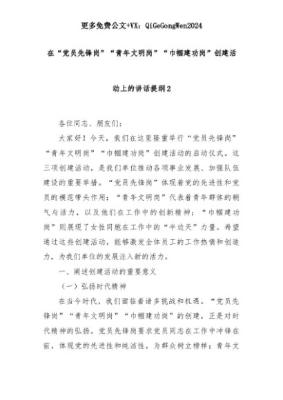 【七哥公文】2025年:【七哥公文】在“党员先锋岗”“青年文明岗”“巾帼建功岗”创建活动上的讲话提纲2+更多免费公文+VX:QiGeGongWen2024+更多免费公文+VX:QiGeGongWen2024