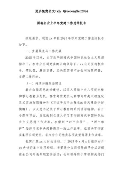 【七哥公文】2025年:【七哥公文】国有企业上半年党建工作总结报告+更多免费公文+VX:QiGeGongWen2024+更多免费公文+VX:QiGeGongWen2024