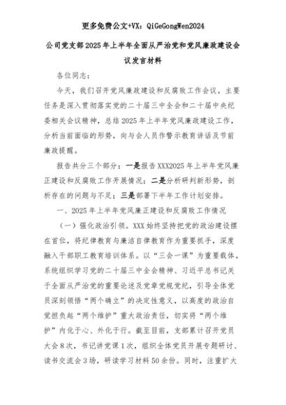 【七哥公文】2025年:【七哥公文】公司党支部2025年上半年全面从严治党和党风廉政建设会议发言材料+更多免费公文+VX:QiGeGongWen2024+更多免费公文+VX:QiGeGongWen2024