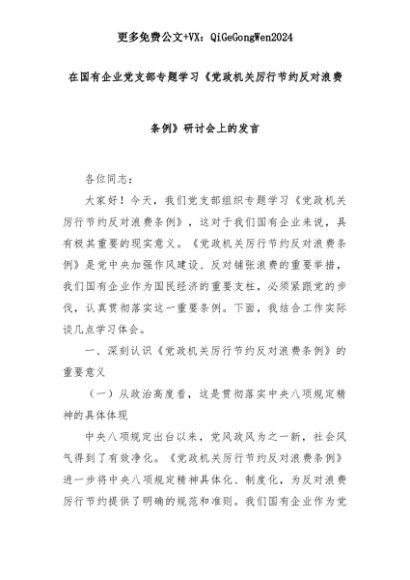 【七哥公文】2025年:【七哥公文】在国有企业党支部专题学习《党政机关厉行节约反对浪费条例》研讨会上的发言+更多免费公文+VX:QiGeGongWen2024+更多免费公文+VX:QiGeGongWen2024