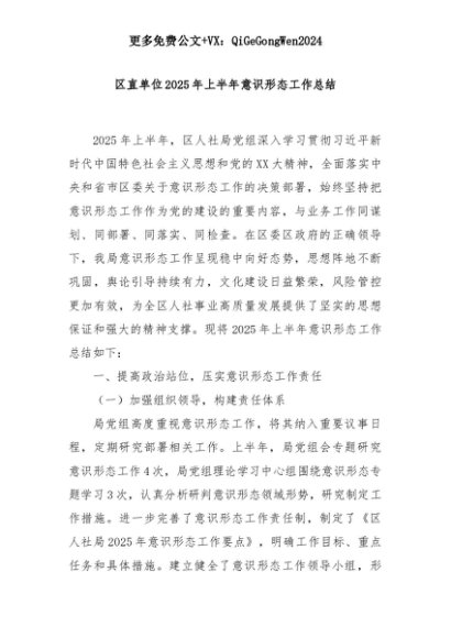 【七哥公文】2025年:【七哥公文】区直单位2025年上半年意识形态工作总结+更多免费公文+VX:QiGeGongWen2024+更多免费公文+VX:QiGeGongWen2024