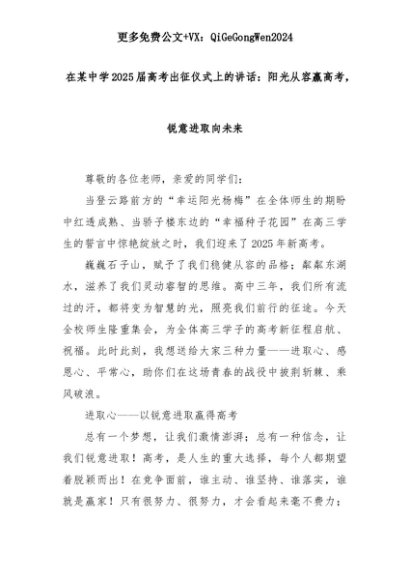 【七哥公文】2025年:【七哥公文】在某中学2025届高考出征仪式上的讲话:阳光从容赢高考,锐意进取向未来+更多免费公文+VX:QiGeGongWen2024+更多免费公文+VX:QiGeGongWen2024