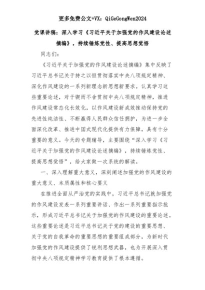 【七哥公文】2025年:【七哥公文】党课讲稿:深入学习《习近平关于加强党的作风建设论述摘编》,持续锤炼党性、提高思想觉悟+更多免费公文+VX:QiGeGongWen2024+更多免费公文+VX:QiGeGongWen2024