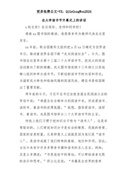 【七哥公文】2025年:【七哥公文】在大学读书节开幕式上的讲话+更多免费公文+VX:QiGeGongWen2024+更多免费公文+VX:QiGeGongWen2024
