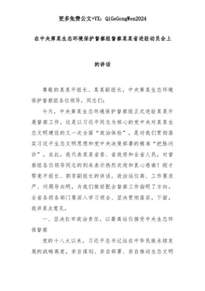 【七哥公文】2025年:【七哥公文】在中央第某生态环境保护督察组督察某某省进驻动员会上的讲话+更多免费公文+VX:QiGeGongWen2024+更多免费公文+VX:QiGeGongWen2024