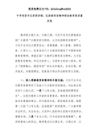 【七哥公文】2025年:【七哥公文】中学党委书记党课讲稿:弘扬教育家精神推动教育高质量发展+更多免费公文+VX:QiGeGongWen2024+更多免费公文+VX:QiGeGongWen2024