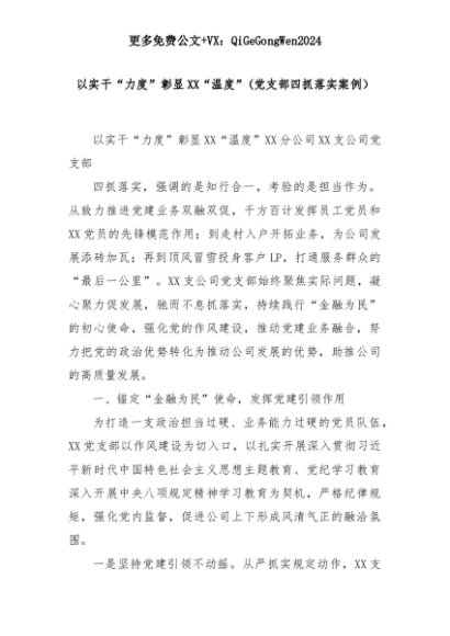 【七哥公文】2025年:【七哥公文】以实干“力度”彰显XX“温度”(党支部四抓落实案例)+更多免费公文+VX:QiGeGongWen2024+更多免费公文+VX:QiGeGongWen2024