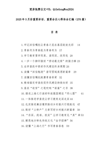 【七哥公文】2025年:【七哥公文】(270篇)2025年5月份重要讲话、重要会议心得体会汇编+更多免费公文+VX:QiGeGongWen2024+更多免费公文+VX:QiGeGongWen2024