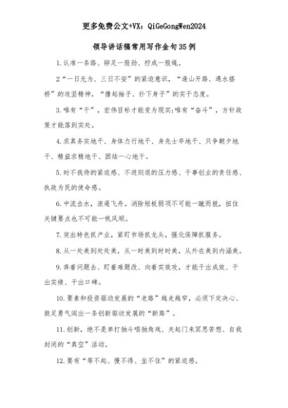 【七哥公文】2025年:【七哥公文】领导讲话稿常用写作金句35例+更多免费公文+VX:QiGeGongWen2024+更多免费公文+VX:QiGeGongWen2024
