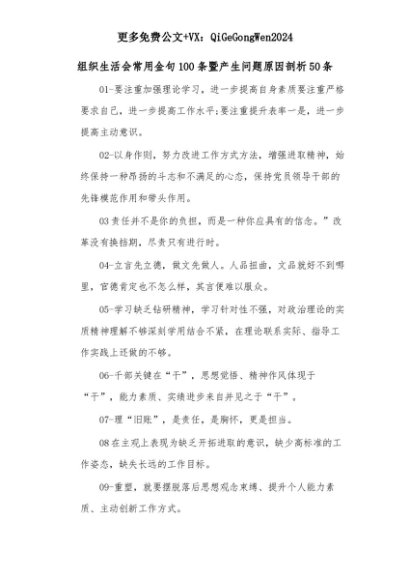 【七哥公文】2025年:【七哥公文】组织生活会常用金句100条暨产生问题原因剖析50条+更多免费公文+VX:QiGeGongWen2024+更多免费公文+VX:QiGeGongWen2024