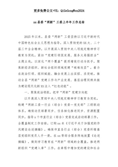 【七哥公文】2025年:【七哥公文】xx县委“两新”工委上半年工作总结+更多免费公文+VX:QiGeGongWen2024+更多免费公文+VX:QiGeGongWen2024