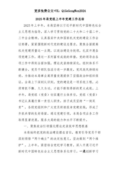 【七哥公文】2025年:【七哥公文】2025年局党组上半年党建工作总结+更多免费公文+VX:QiGeGongWen2024+更多免费公文+VX:QiGeGongWen2024