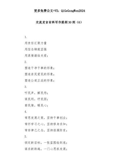 【七哥公文】2025年:【七哥公文】交流发言材料写作提纲30例(6)+更多免费公文+VX:QiGeGongWen2024+更多免费公文+VX:QiGeGongWen2024