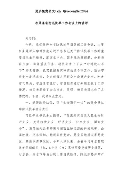 【七哥公文】2025年:【七哥公文】在某某省防汛抗旱工作会议上的讲话+更多免费公文+VX:QiGeGongWen2024+更多免费公文+VX:QiGeGongWen2024