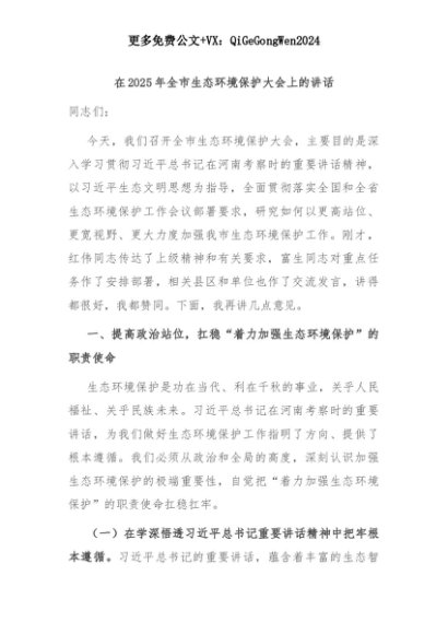 【七哥公文】2025年:【七哥公文】在2025年全市生态环境保护大会上的讲话+更多免费公文+VX:QiGeGongWen2024+更多免费公文+VX:QiGeGongWen2024
