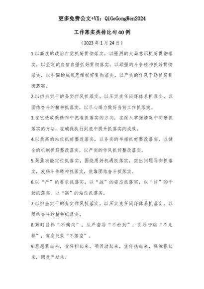【七哥公文】2025年:【七哥公文】工作落实类排比句40例+更多免费公文+VX:QiGeGongWen2024+更多免费公文+VX:QiGeGongWen2024
