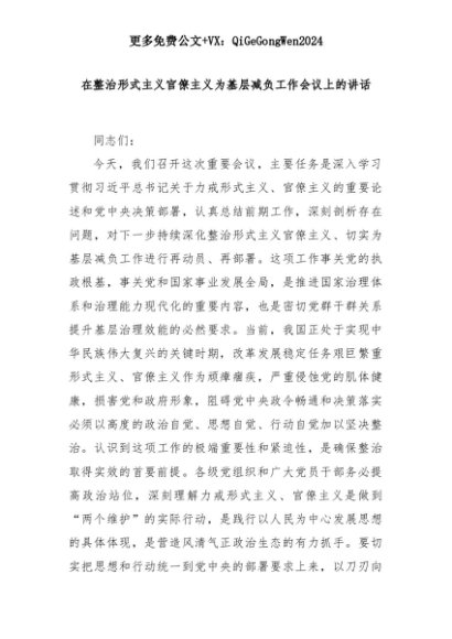 【七哥公文】2025年:【七哥公文】在整治形式主义官僚主义为基层减负工作会议上的讲话+更多免费公文+VX:QiGeGongWen2024+更多免费公文+VX:QiGeGongWen2024