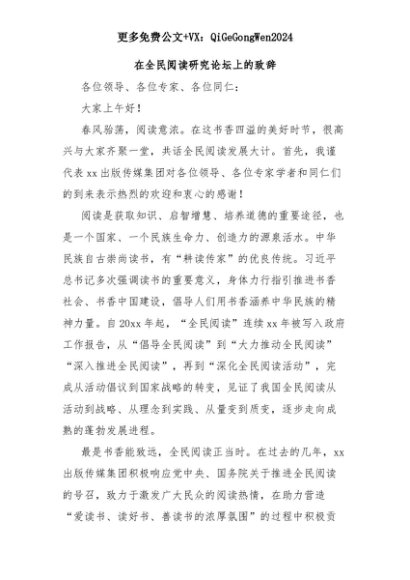【七哥公文】2025年:【七哥公文】在全民阅读研究论坛上的致辞+更多免费公文+VX:QiGeGongWen2024+更多免费公文+VX:QiGeGongWen2024