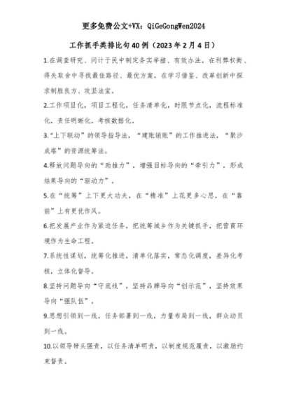 【七哥公文】2025年:【七哥公文】工作抓手类排比句40例(2023年2月4日)+更多免费公文+VX:QiGeGongWen2024+更多免费公文+VX:QiGeGongWen2024