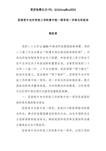 【七哥公文】2025年:【七哥公文】坚持党中央对科技工作的集中统一领导进一步深化科技体制改革+更多免费公文+VX:QiGeGongWen2024+更多免费公文+VX:QiGeGongWen2024