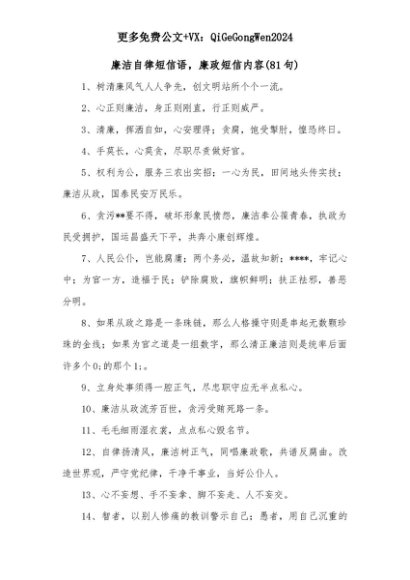 【七哥公文】2025年:【七哥公文】廉洁自律短信语,廉政短信内容(81句)+更多免费公文+VX:QiGeGongWen2024+更多免费公文+VX:QiGeGongWen2024