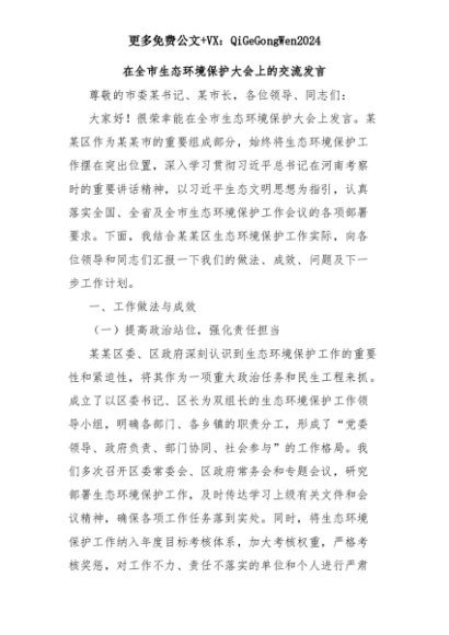 【七哥公文】2025年:【七哥公文】在全市生态环境保护大会上的交流发言+更多免费公文+VX:QiGeGongWen2024+更多免费公文+VX:QiGeGongWen2024
