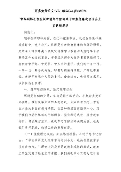 【七哥公文】2025年:【七哥公文】常务副部长在组织部端午节前机关干部集体廉政谈话会上的讲话提纲+更多免费公文+VX:QiGeGongWen2024+更多免费公文+VX:QiGeGongWen2024