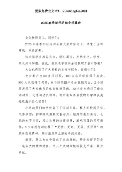 【七哥公文】2025年:【七哥公文】2025春季田径运动会闭幕辞+更多免费公文+VX:QiGeGongWen2024+更多免费公文+VX:QiGeGongWen2024