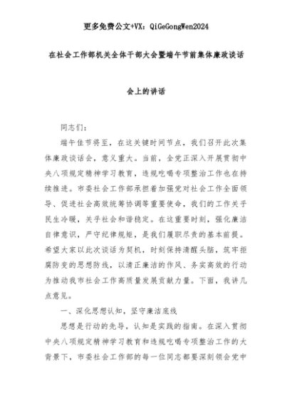 【七哥公文】2025年:【七哥公文】在社会工作部机关全体干部大会暨端午节前集体廉政谈话会上的讲话+更多免费公文+VX:QiGeGongWen2024+更多免费公文+VX:QiGeGongWen2024