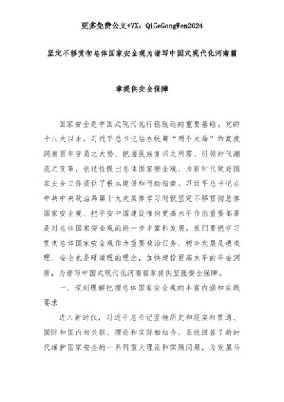 【七哥公文】2025年:【七哥公文】坚定不移贯彻总体国家安全观为谱写中国式现代化河南篇章提供安全保障+更多免费公文+VX:QiGeGongWen2024+更多免费公文+VX:QiGeGongWen2024