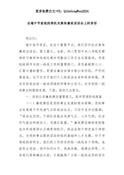 【七哥公文】2025年:【七哥公文】在端午节前统战部机关集体廉政谈话会上的讲话+更多免费公文+VX:QiGeGongWen2024+更多免费公文+VX:QiGeGongWen2024