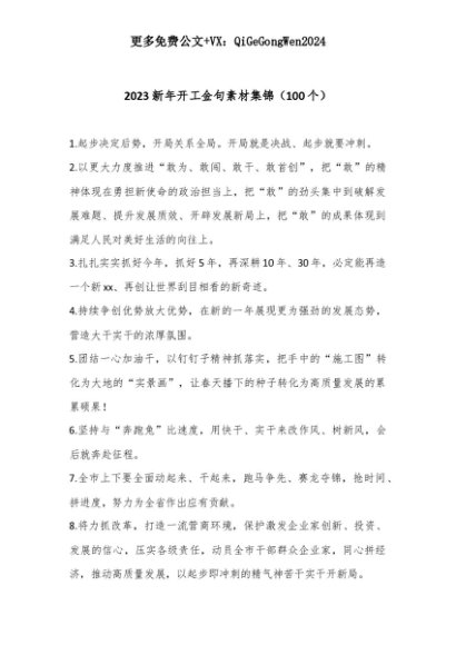 【七哥公文】2025年:【七哥公文】(100个)2023新年开工金句素材集锦+更多免费公文+VX:QiGeGongWen2024+更多免费公文+VX:QiGeGongWen2024
